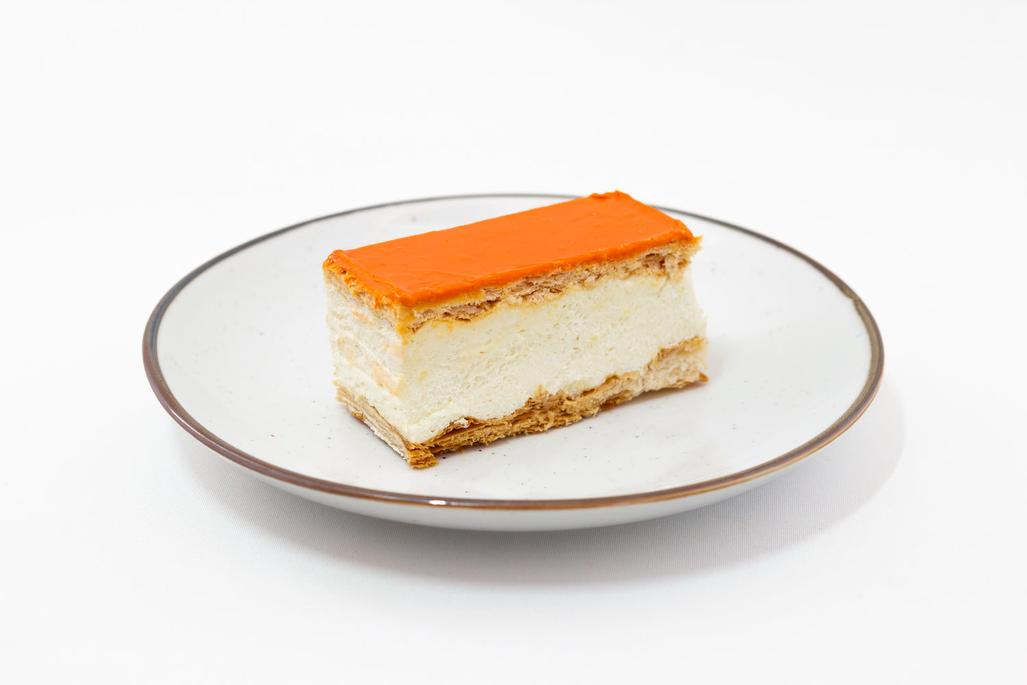 De welbekende tompouce van luchtig, krokant bladerdeeg gevuld met huisgemaakte banketbakkersroom. Afgewerkt in stijl met oranje fondant.